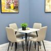 Bàn ăn được thiết kế theo phong cách hiện đại – tối giản, mang đến vẻ đẹp tinh tế và sang trọng cho không gian bếp của bạn. Mặt bàn sử dụng gỗ MDF cao cấp phủ melamine chống trầy xước, chống thấm nước, dễ lau chùi. Khung chân bàn làm từ thép sơn tĩnh điện chắc chắn, chịu lực tốt và bền bỉ theo thời gian.